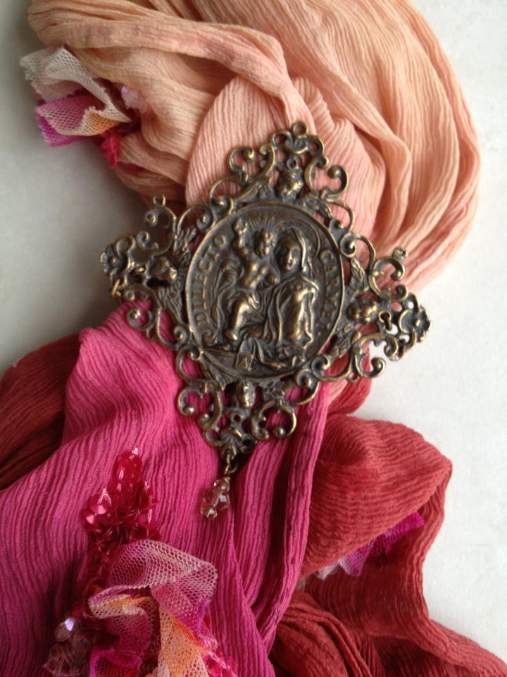 I have finally made up for sale, two beautiful, religious medals for scarf holders or in the summer to hold together a light cardigan or bolero jacket as seen in the photos below. I have one for myself and used it constantly throughout summer and winter, to me it is the wearing of a religious medal that also is functional with my clothing.